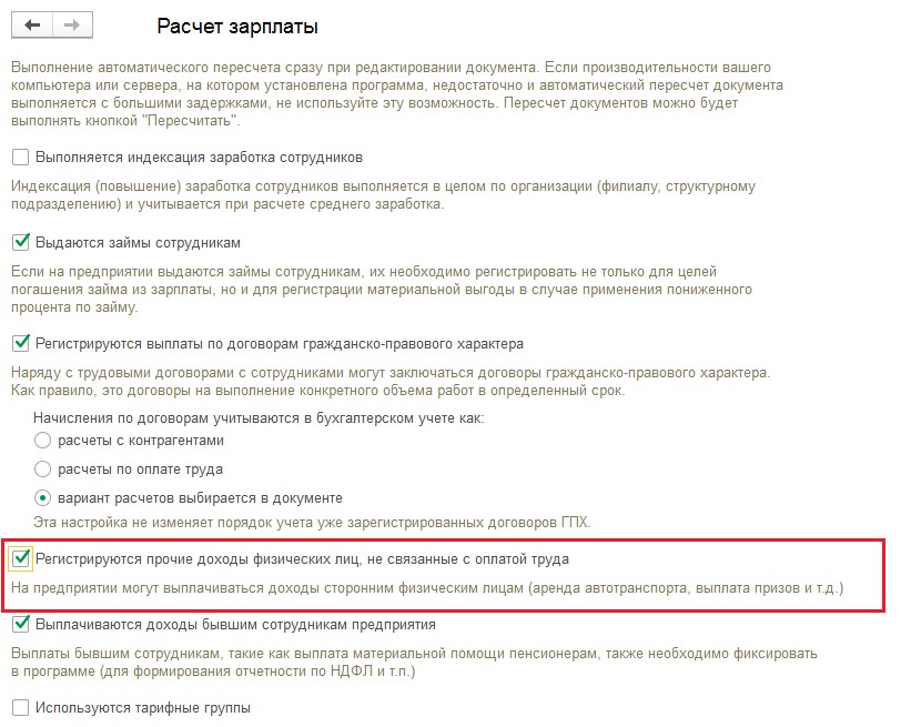 Когда это будет выполнено, в разделе «Зарплата» возникнет документ «Начисление прочих доходов», а вкладка «Выплаты» пополнится справочником «Виды прочих доходов физических лиц».