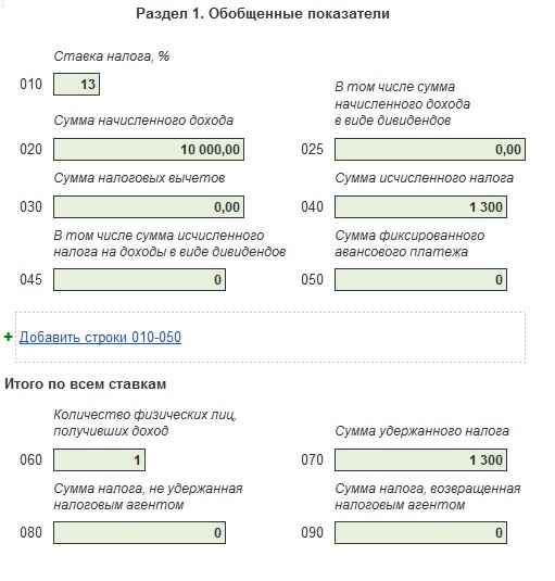 Рассмотрим, как должен заполняться отчёт 6-НДФЛ в этом примере. В первом разделе указываются: сумма начисленного дохода, исчисленного и удержанного налога.