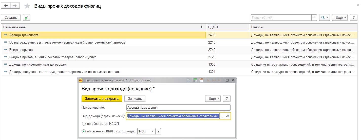 Чтобы заполнить последний, создайте вид прочего дохода «Аренда помещения» и заполните его так, как показано на скриншоте.