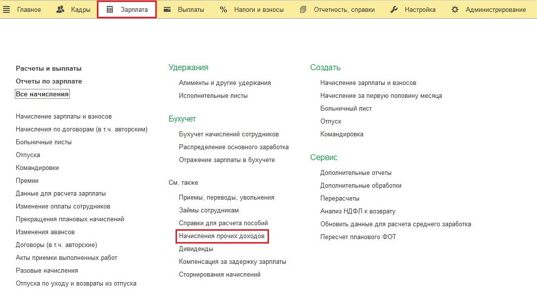 Чтобы оформить начисление средств за аренду, откройте раздел «Зарплата», а там «Начисление прочих доходов».