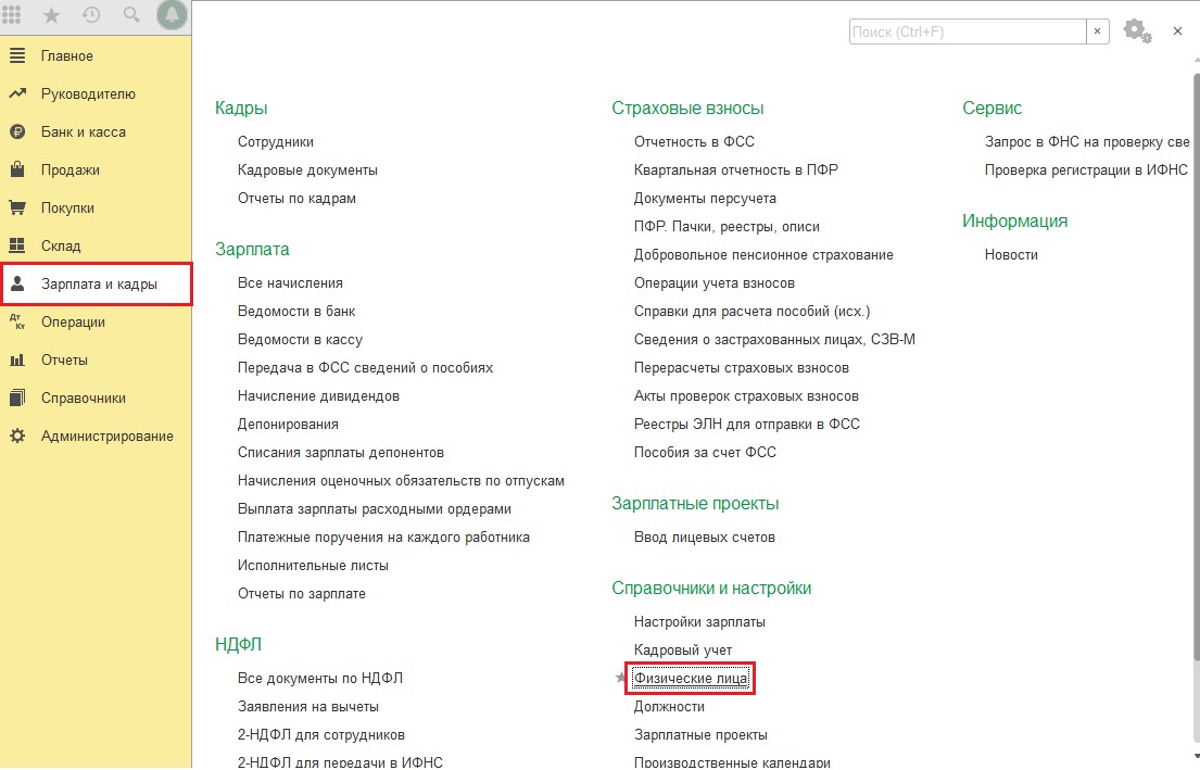 В этой программе нет возможности вести автоматизированный учёт такой операции, потому процесс будет немного длительнее. В первую очередь следует перейти в раздел «Зарплата и кадры» и заполнить справочник «Физические лица».