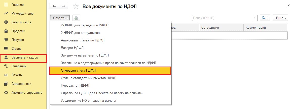 Оформление проводок ещё не означает, что операции будут отражены в налоговых регистрах. Чтобы это обеспечить, перейдите в раздел «Зарплата и кадры», далее «НДФЛ» и «Все документы по НДФЛ», создайте документ «Операция учёта НДФЛ».