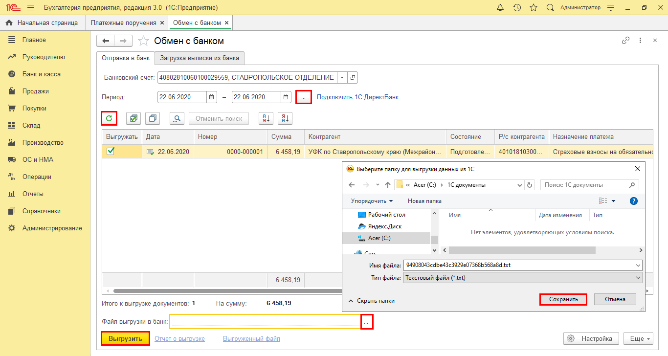 - далее следует нажать на кнопку «Выбрать» в поле «Файл выгрузки в банк». Откроется окно, в котором сформируется название файла в текстовом формате;
