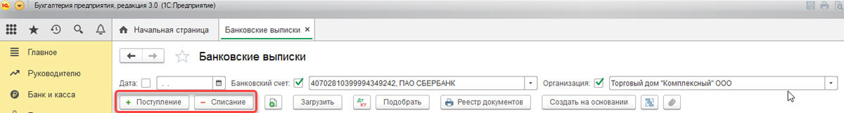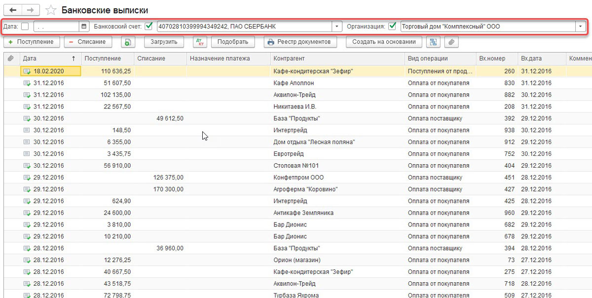 - задать список по конкретной организации, контрагенту, дате или банковскому счету.
