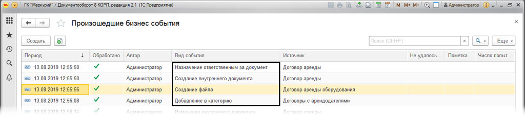 Рассмотрим пример. При создании внутреннего документа «Договор оказания услуг», в регистре будет произведена запись «Создание внутреннего документа». А когда будет сформирован файл договора, в регистре это отразится в виде записи «Создание файла».