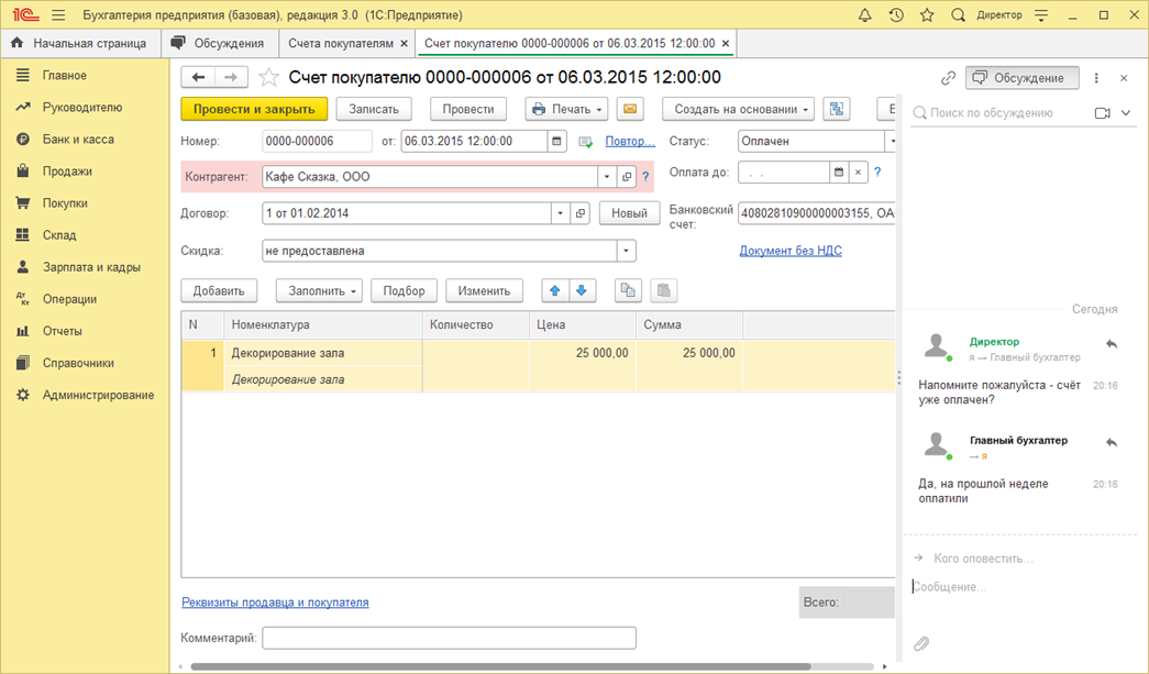 Через данный сервис коммуникация осуществляется непосредственно в окне программы 1С, которая поддерживает обсуждение, связанное с конкретными объектами - документами, отчетами, справочниками и т.д. При этом переписка полностью сохраняется и отображается вместе с объектом обсуждения.