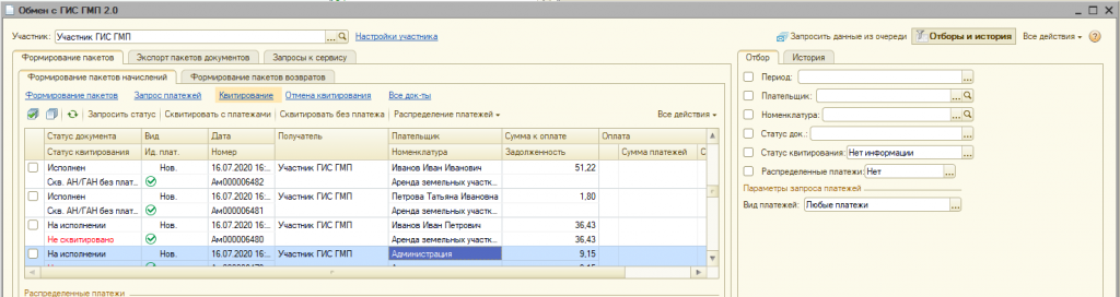 - квитирование распределенных платежей с начислением в ГИС ГМП по инициативе администратора начислений.