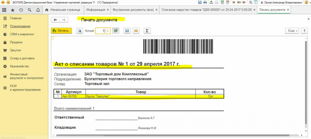 В каждом документе в верхней части есть кнопки типа «Провести и закрыть» или «Записать и закрыть». Например, документ «Заказ Поставщику» должен вносить изменения в состояние расчетов, текущих остатков на складе готовой продукции и заказов, так как у него есть свойство проведения. Для того, чтобы все работало как надо необходимо, чтобы у документа был статус «проведен».