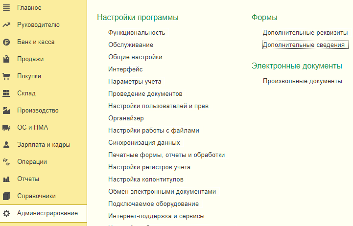 В этом окне выберем вкладку «Дополнительные реквизиты и сведения» и поставим галочку в поле, которое так же называется. Затем переходим в меню «Администрирование-Формы-Дополнительные сведения».