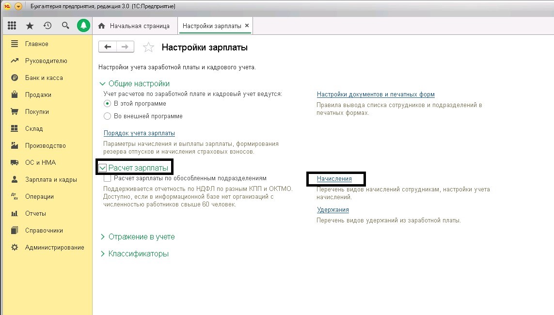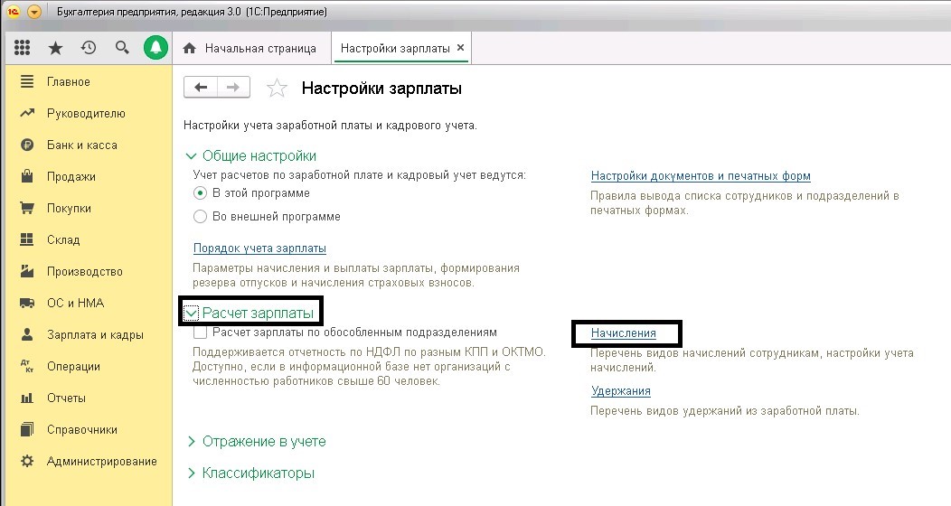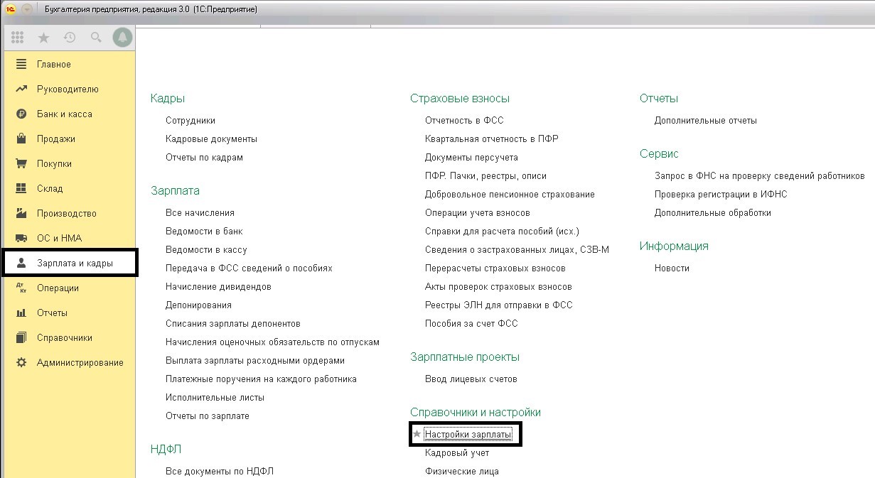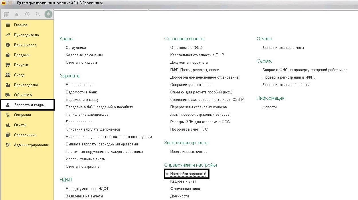 • Нам нужен подраздел «Настройка Зарплаты», расположенный в меню «Зарплата и кадры».