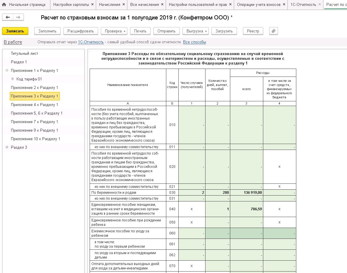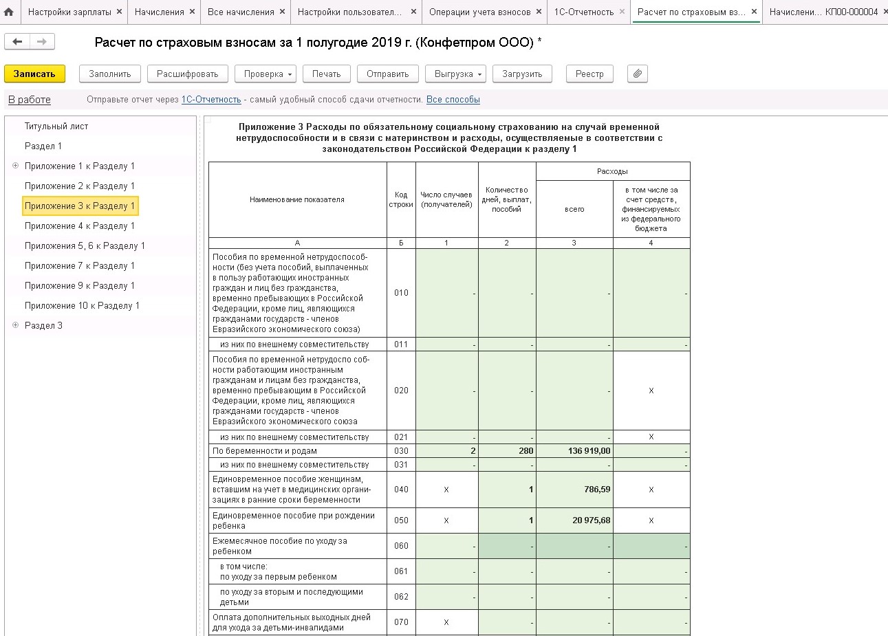 С учетом того, что начисление было выполнено в апреле прошлого года, проверим оформление отчетности «Расчет по страховым взносам» за полугодие 2019 года.