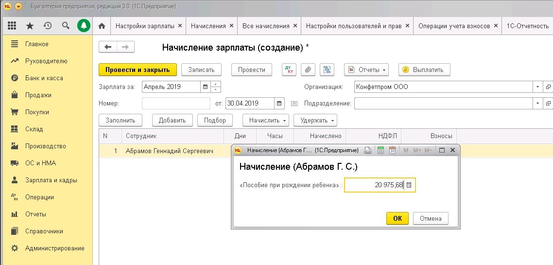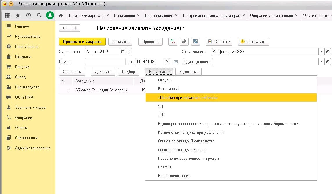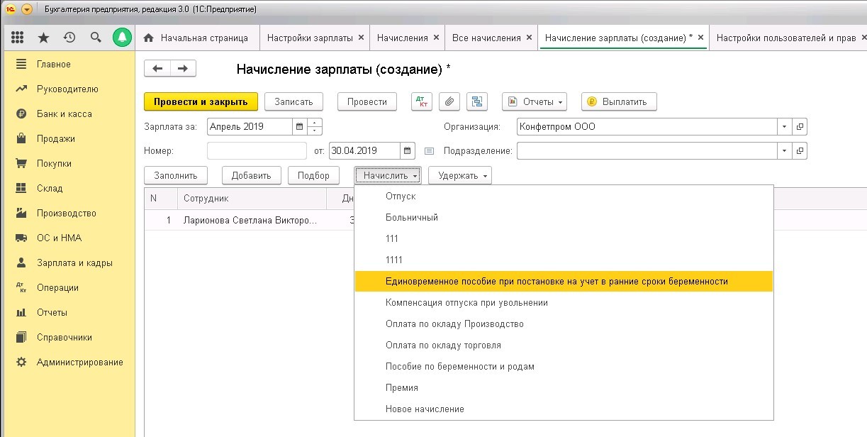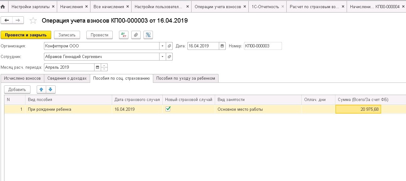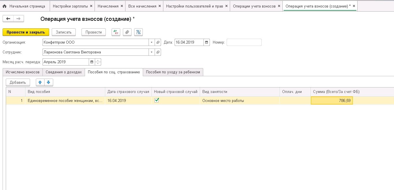 • Вносим данные и завершаем работу в данном разделе. назначить пособие нужного нам типа можно, используя документ «Начисление зарплаты».