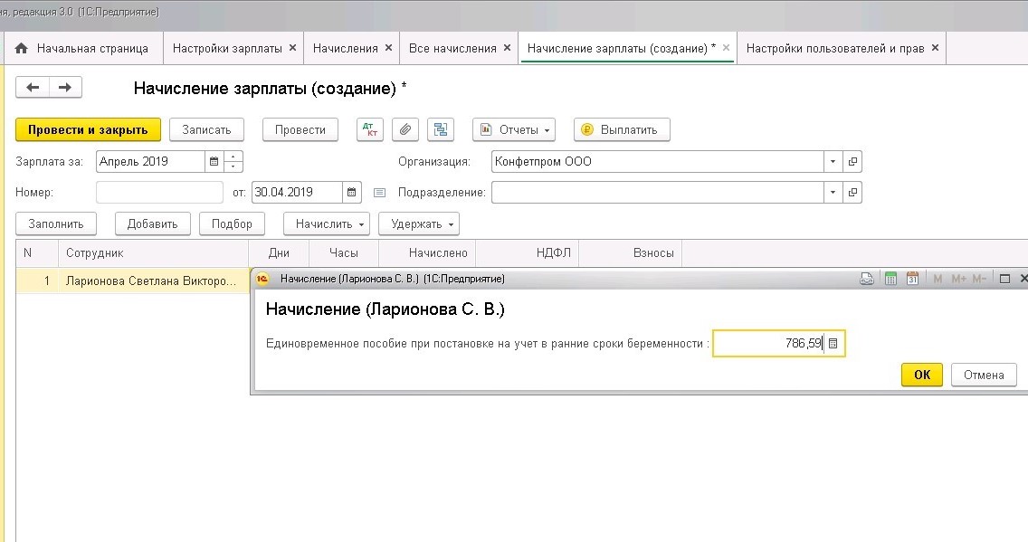 • Теперь оформляем документ, указываем работницу, на имя которой приходится пособие, и, кликом по «Начислить» определяем из выпавшего окна только что созданное начисление.