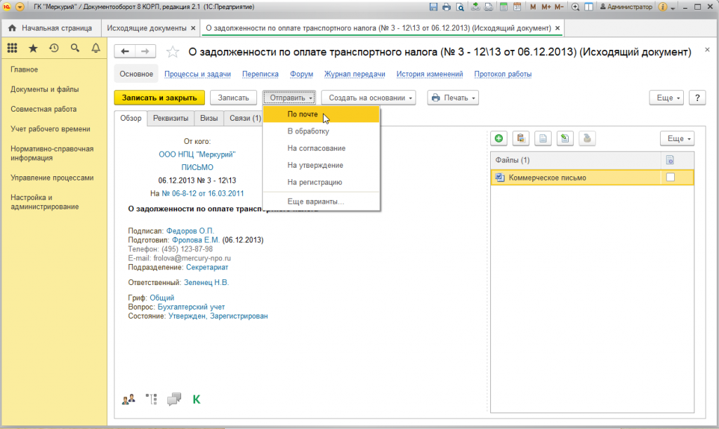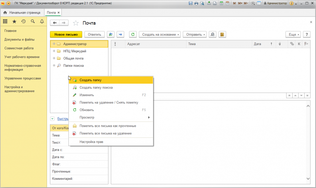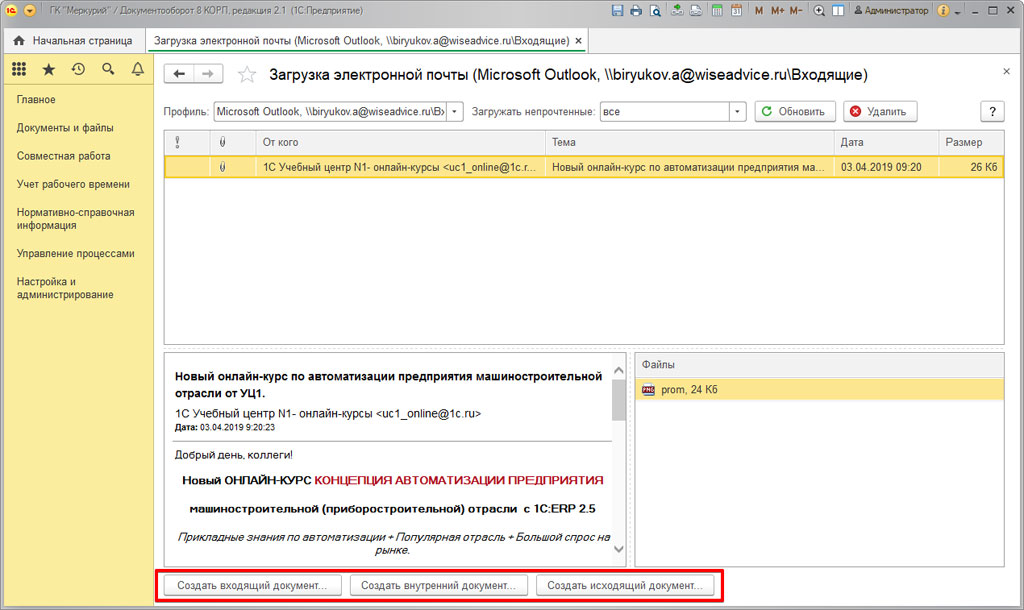 Электронная почта в 1С Документооборот