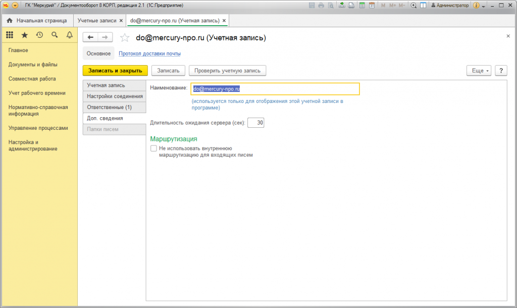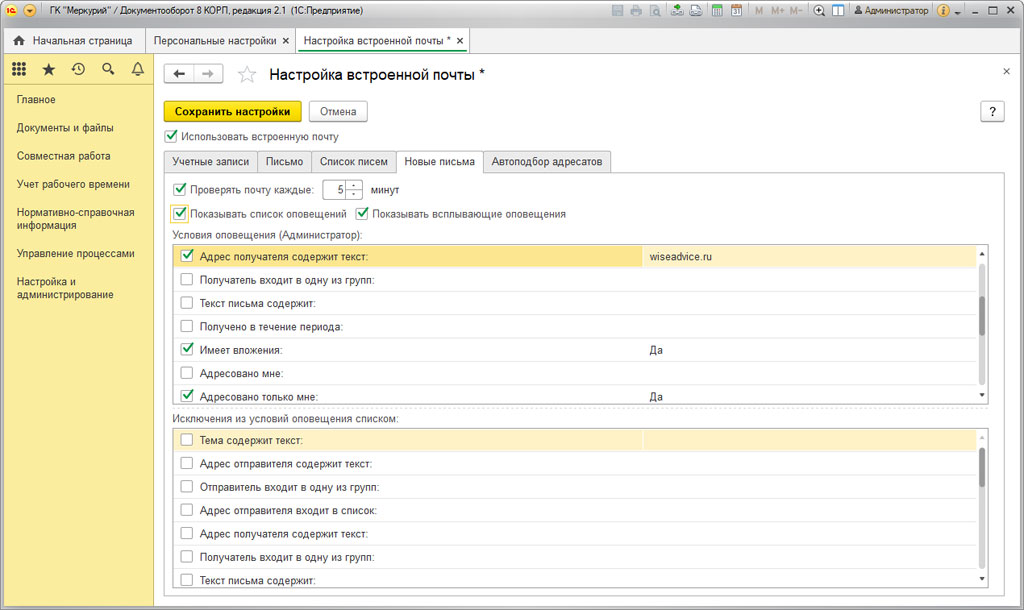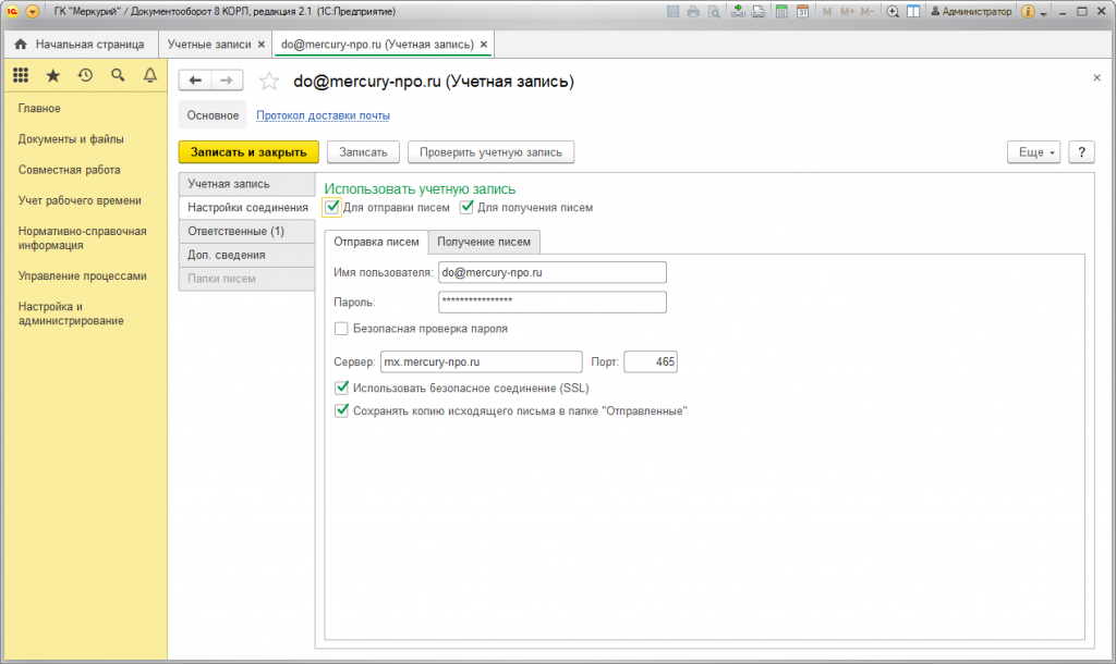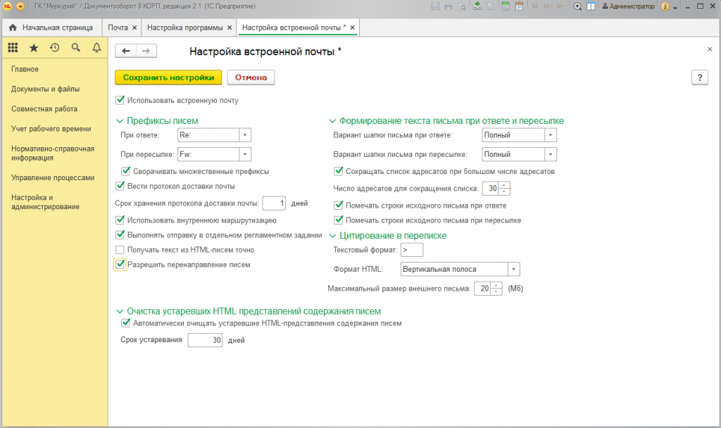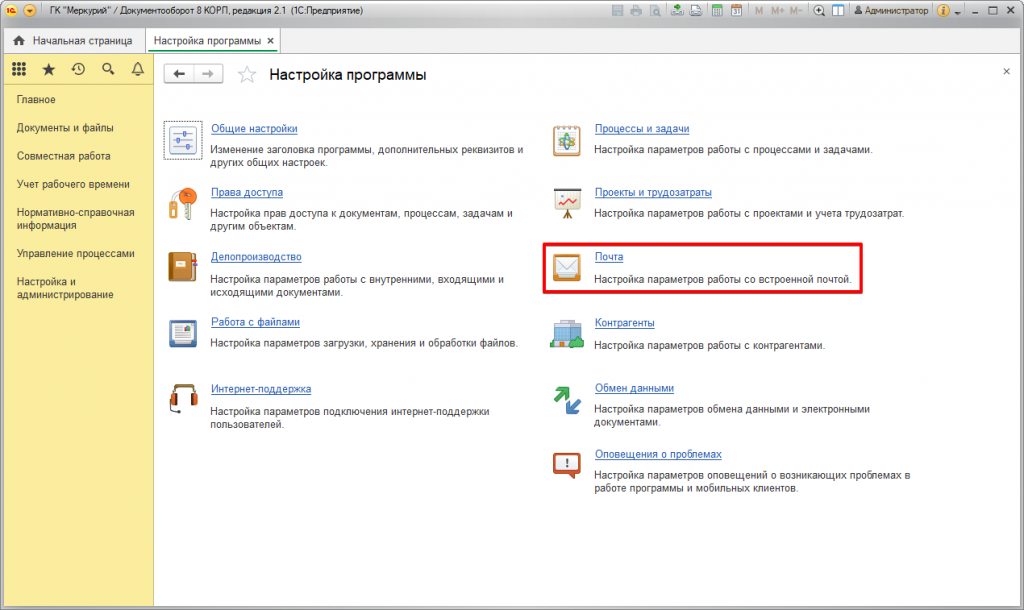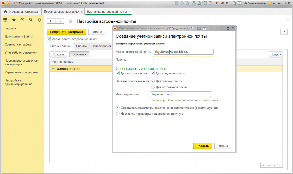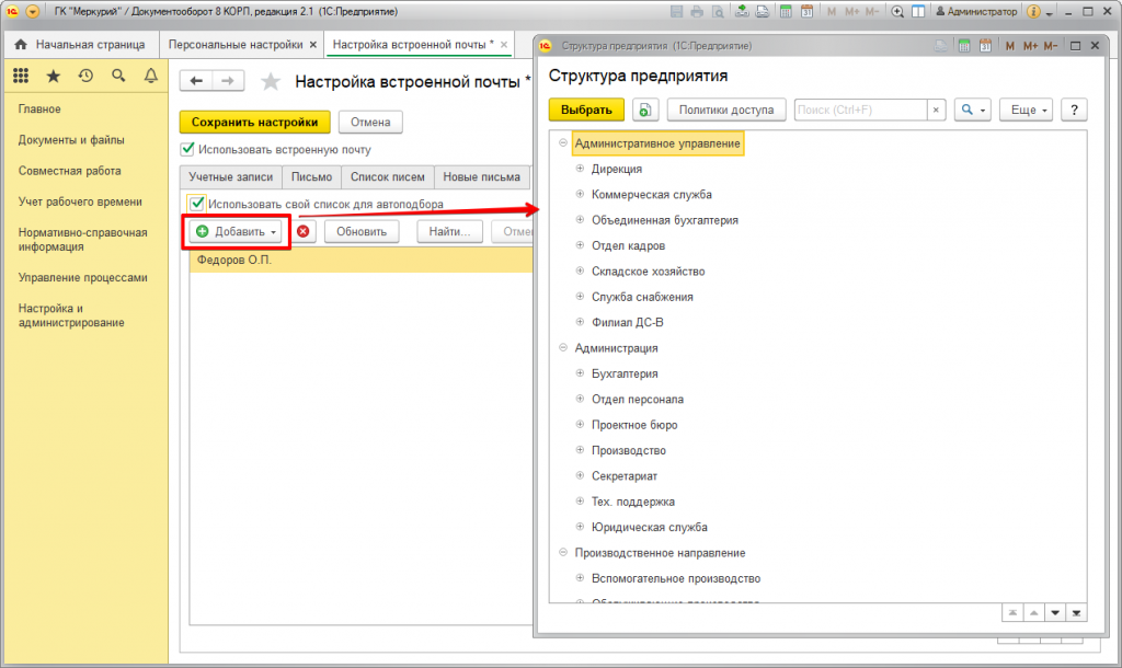 Настройка встроенной почты в 1С:Документооборот 8 КОРП
