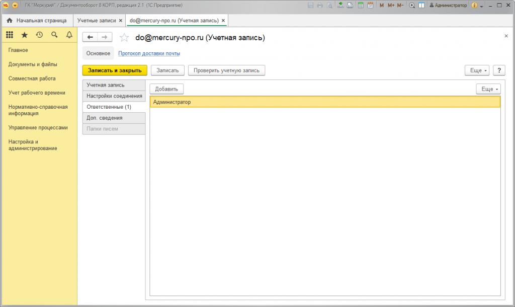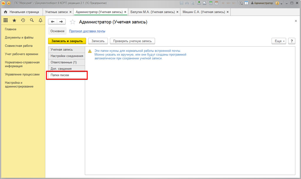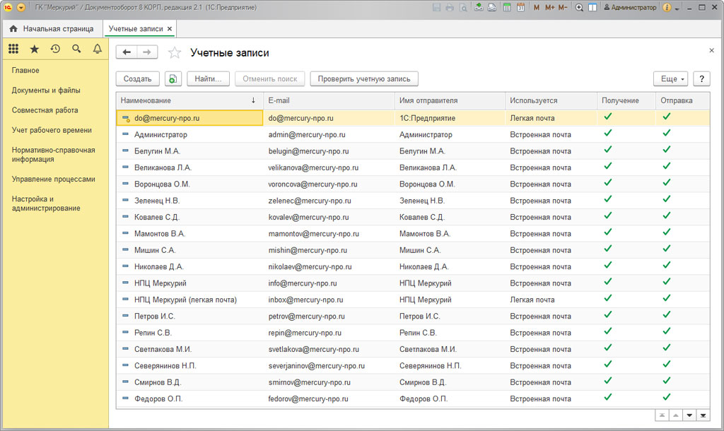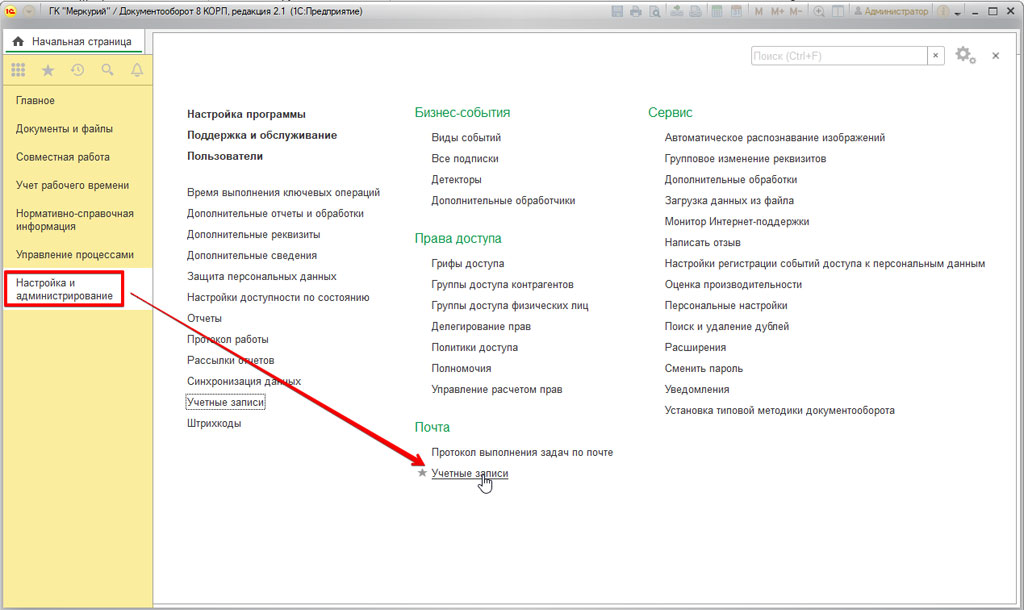 Учетная запись, которая позволяет выполнять рассылку уведомлений и обеспечивает работу прочего функционала (например, опция «Выполнение задач по почте»), работает только на базе легкой почты. Для того, чтобы настроить свою учетную запись, необходимо на начальной странице в разделе «Настройка и администрирование» открыть пункт «Учетные записи».