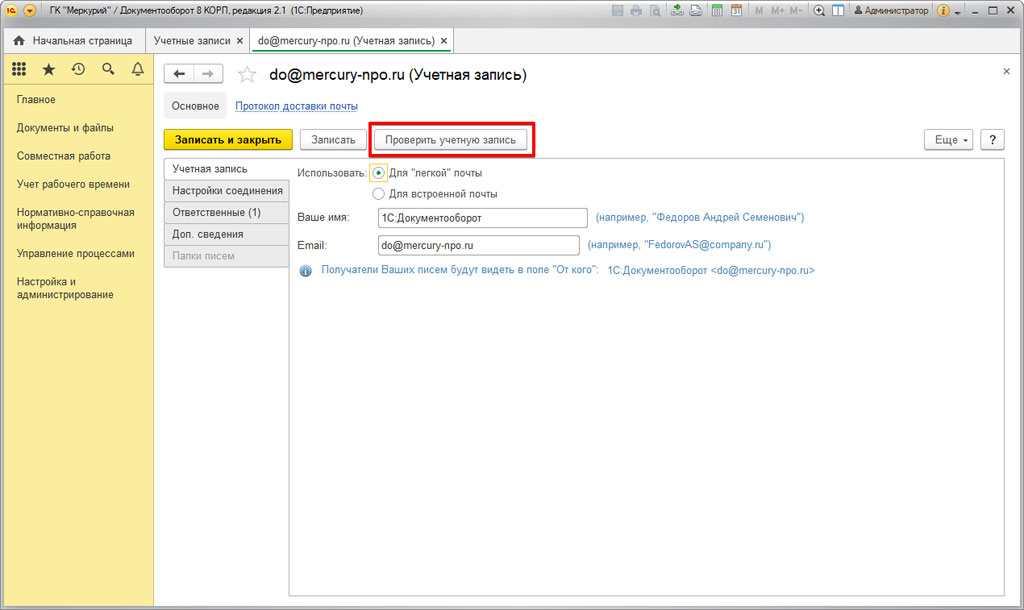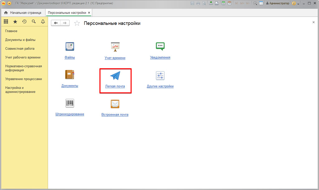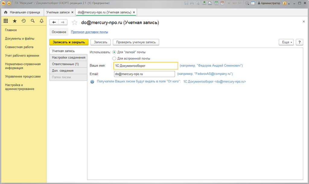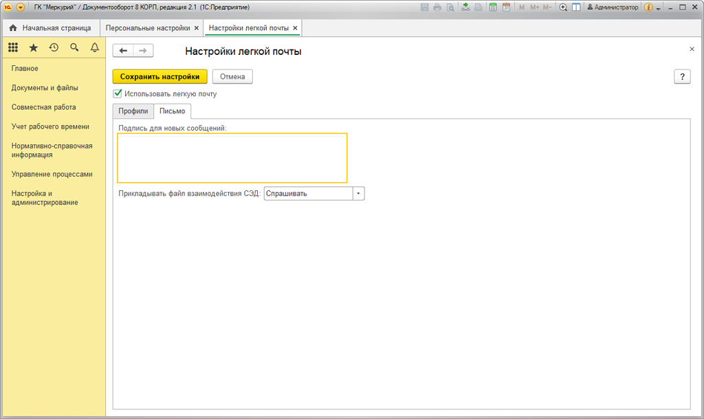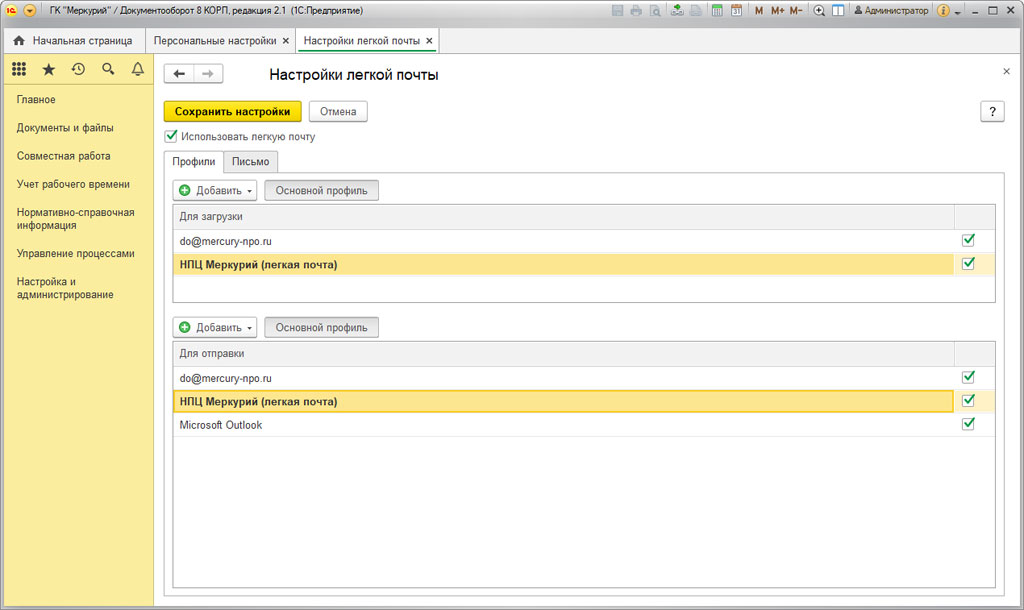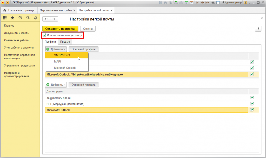 Настройка легкой почты в 1С:Документооборот
