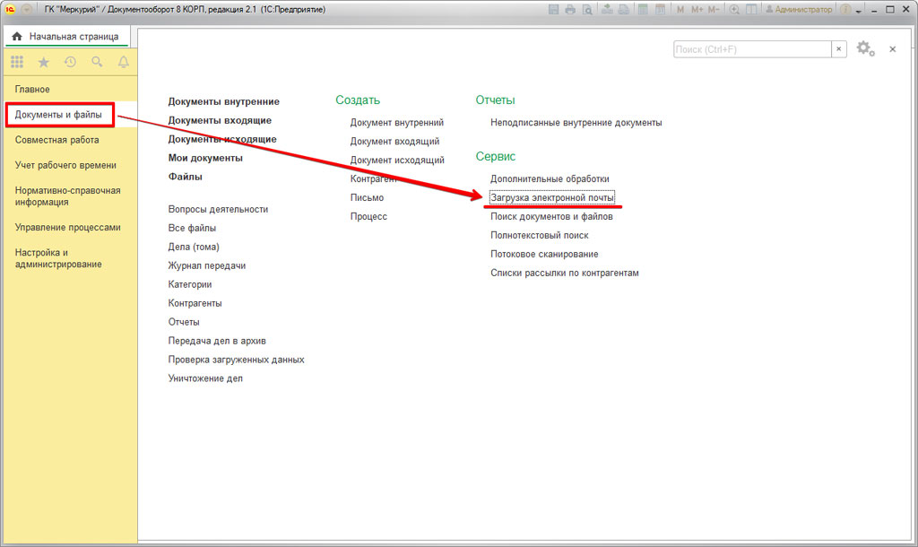 Возвратившись на начальную страницу, в разделе «Документы и файлы» нужно найти пункт «Загрузка электронной почты» - это место для получения входящих отправлений посредством легкой почты.