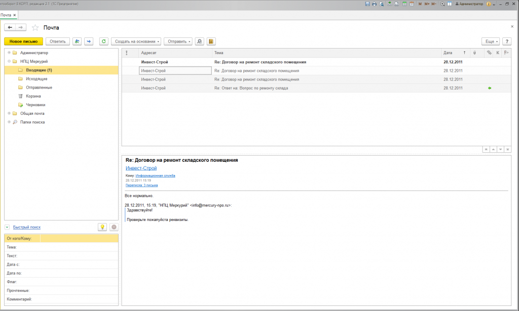 Встроенная почта 1С:Документооборот – это полноценный почтовый клиент, который во многом имеет функционал, аналогичный стандартным почтовым программам – The Bat!, Outlook, Mozilla и другие.