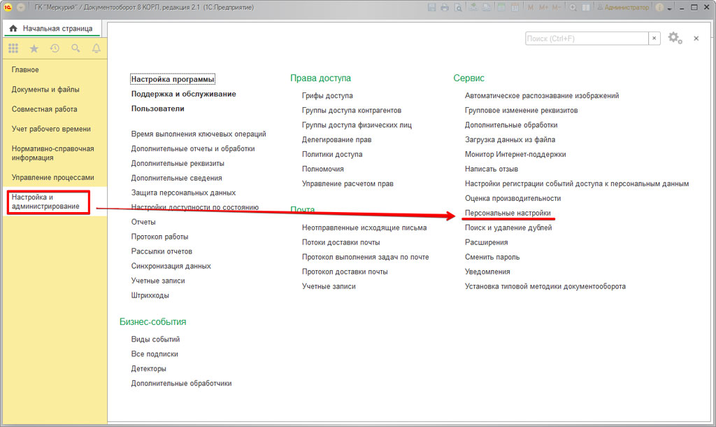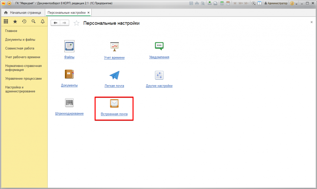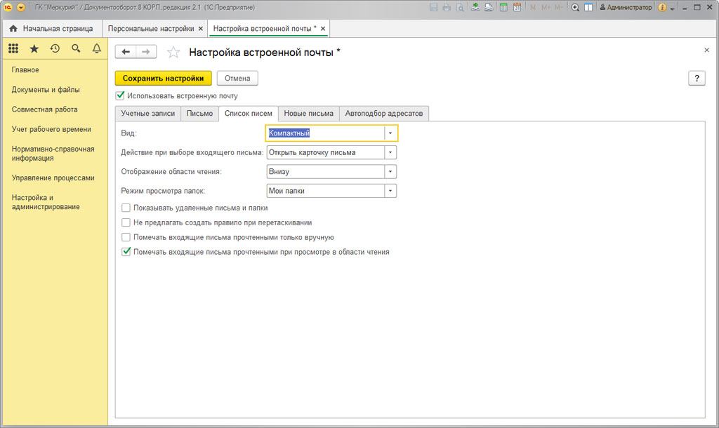 Можно выполнить и персональные настройки встроенной почты. Эта возможность есть в одноименном пункте в разделе «Настройка и администрирование».