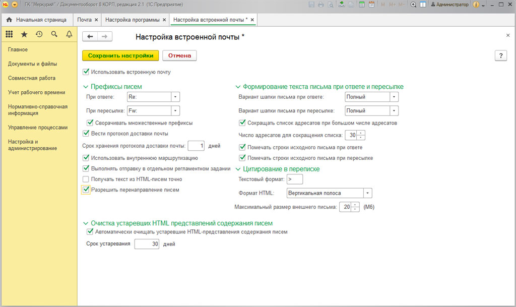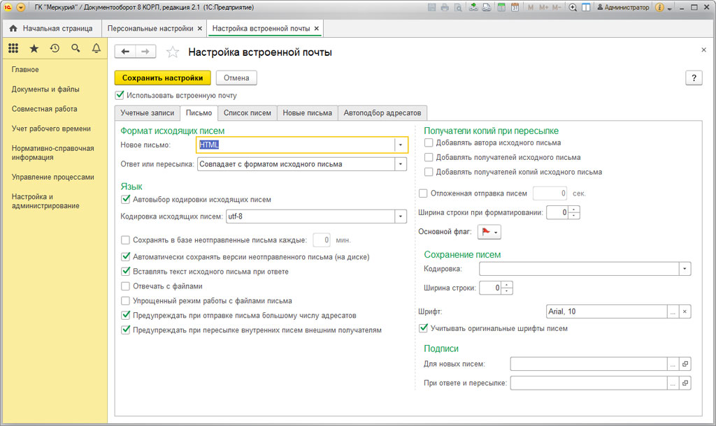 Как видно, 1С:Документооборот 8 КОРП позволяет пользователям задавать множество различных настроек для встроенной системной почты.