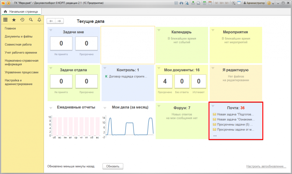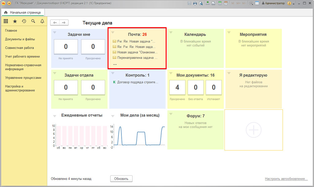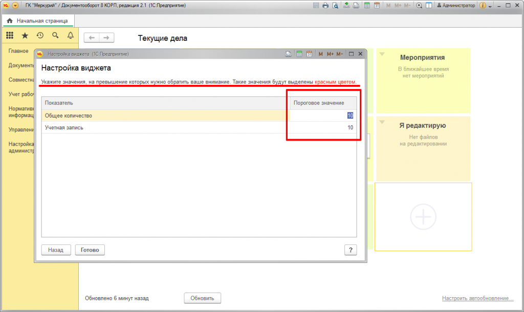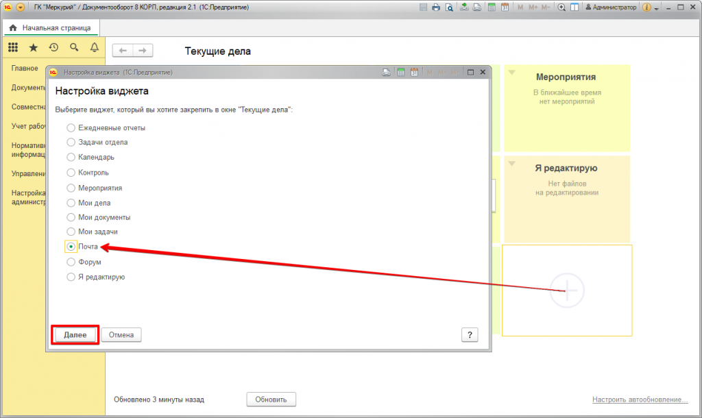 Настройки виджета почты в 1С:Документооборот