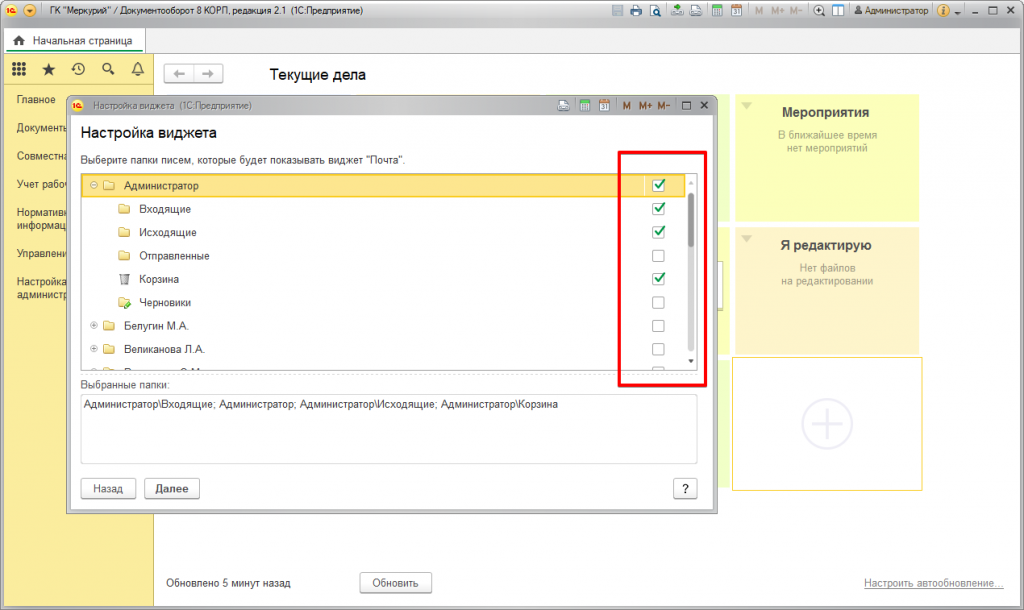 Для того, чтобы виджет встроенной почты отобразился на рабочем столе системы 1С:Документооборот 8 КОРП, необходимо отметить соответствующие папки во всплывающем окне.