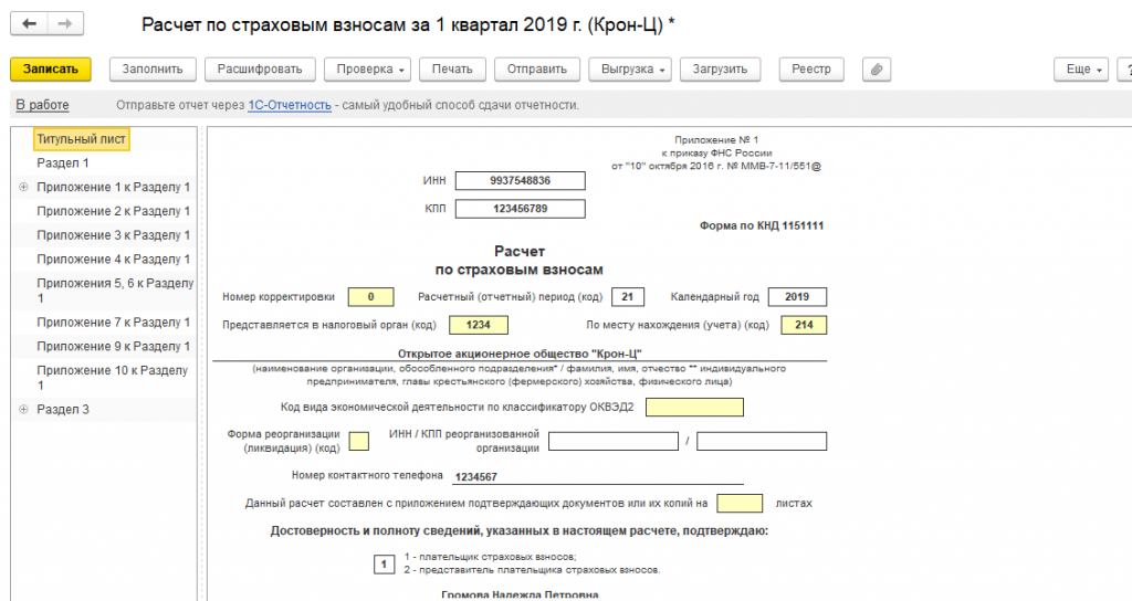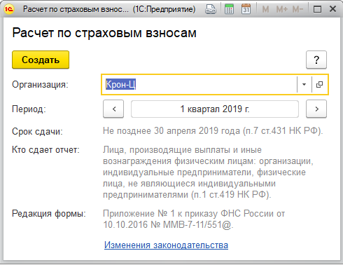 В следствии, нажатия кнопки «Выбрать» должна появиться форма для составления нового отчета «Расчет по страховым взносам».