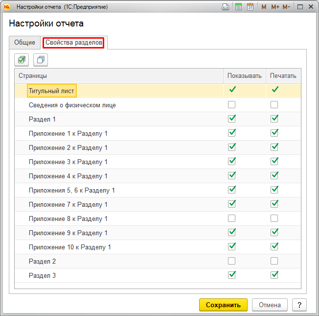 • Сделать распечатку отчета, либо выгрузить его электронную форму, в случае если его отправка будет производиться по электронным каналам связи. Как правило, под понятием настройка состава заполнения, обычно подразумевается удаление разделов, которые являются необязательными в составе отчета. Такие разделы не заполняются и не предоставляются в случаях отсутствия соответствующих показателей. Для настройки состава заполнения нужно перейти в режим для просмотра всех имеющихся разделов РСВ. И нажав на кнопку «Еще», раздел «Настройка», в котором на вкладке «Свойства разделов» исключить колонки «Печатать» и «Показывать».