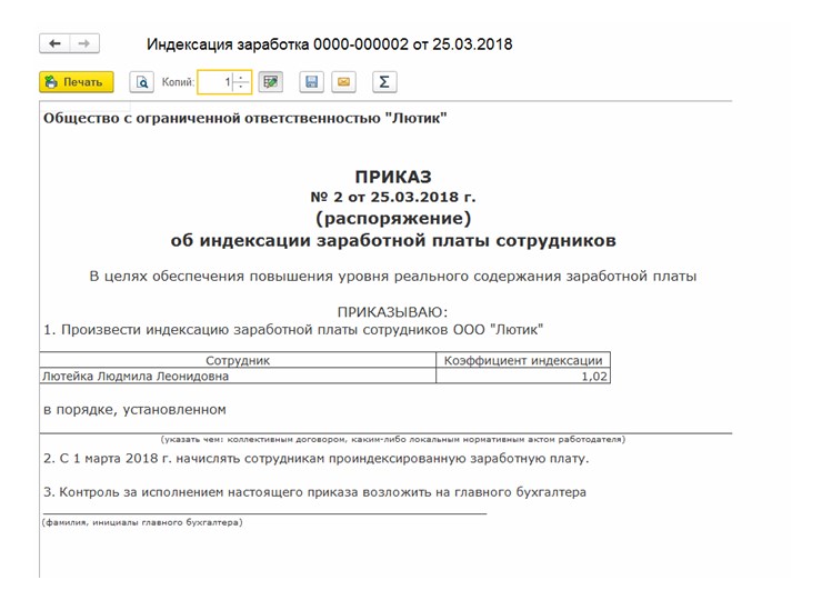 Очень важно сравнить значения графы Оклады в созданных документах, они не должны различаться. Дата, месяц и коэффициент индексации в документах индексации Штатного расписания и заработной платы тоже должны совпадать. После проверки нажать на плашку Провести и закрыть. Если вдруг приказ об индексации необходим к печати, то сделать это можно с помощью одноименной кнопки.