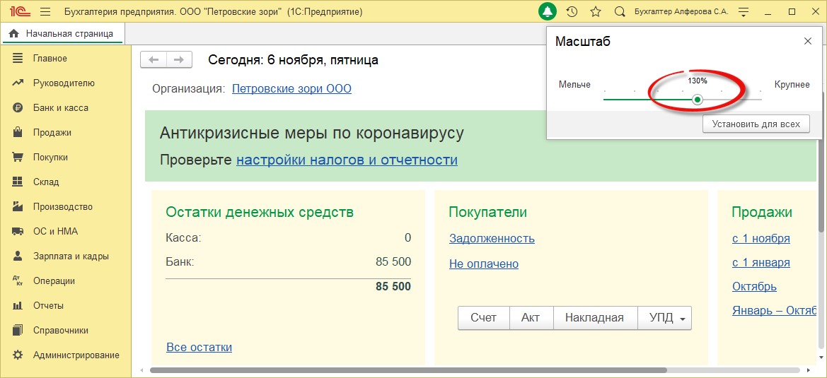 После этого нажимаем кнопку «Установить для всех», настройка применится ко всем пользователям. При изменении масштаба и закрытии окошка – изменения коснуться только текущего компьютера. Данный лайфхак применим к любой конфигурации 1С.