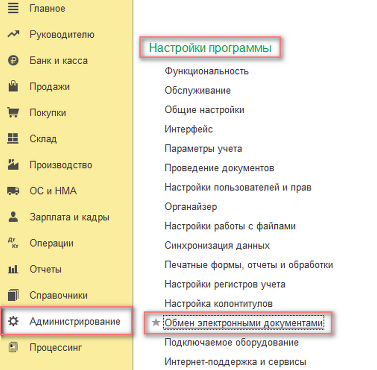 - В разделе «Администрирование» в пункте «Настройки программы» выбираем пункт «Обмен ЭД».