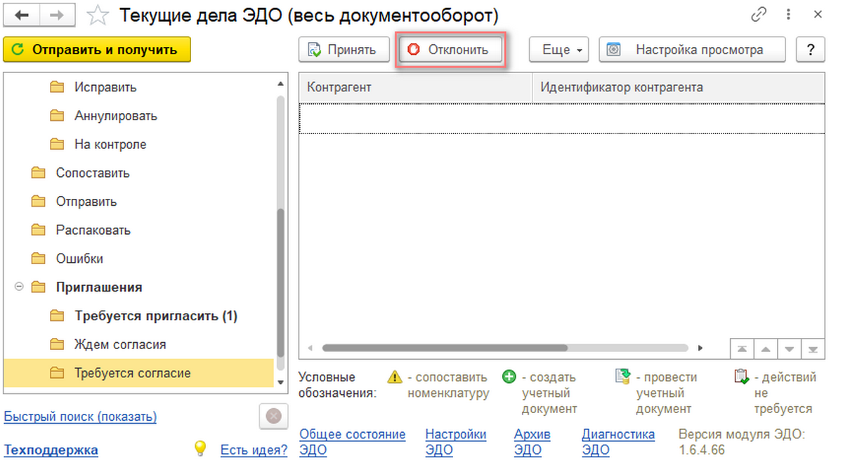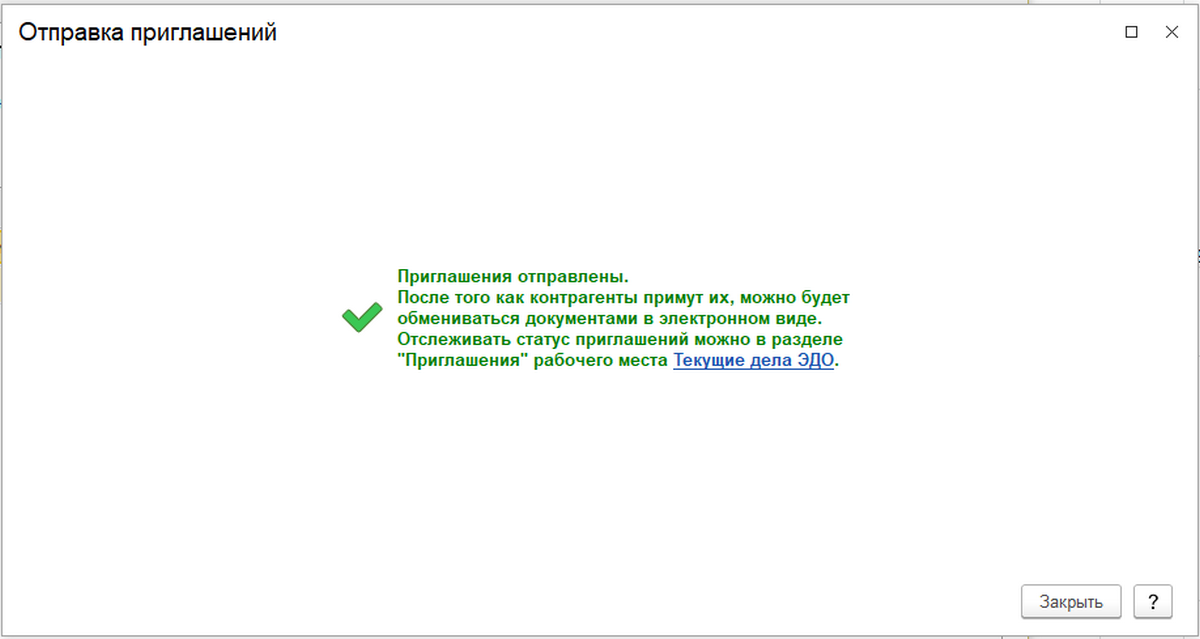 В отправленном приглашении содержатся ссылки на инструкции по правильной настройке. После того как принимающая сторона завершит настройку работы системы, электронные документы, подлежащие обороту, будут отправлены в автоматическом режиме. Статус отправленных приглашений пользователем может отслеживаться в папке «Текущие дела». Наименования подразделов соответствуют текущему состоянию приглашения: «Ждем согласие», «Требуется согласие» и так далее.