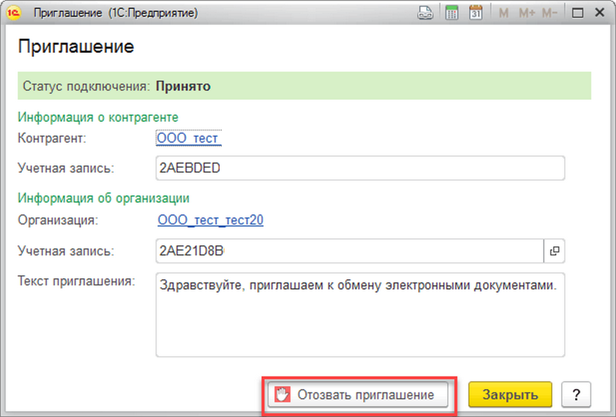 В рассматриваемом примере приглашение контрагента выполнялось через 1C:Бухгалтерию конфигурации 3.0 версии КОРП.