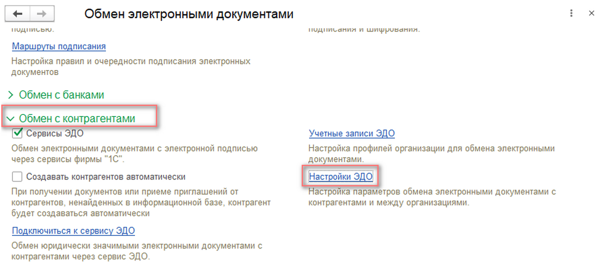 - В открывшемся окне необходимо развернуть пункт «Обмен с контрагентами». В этом случае будет открыто поле с несколькими ссылками и флажками. Среди них находим ссылку «Настройки ЭДО» и кликаем на нее.