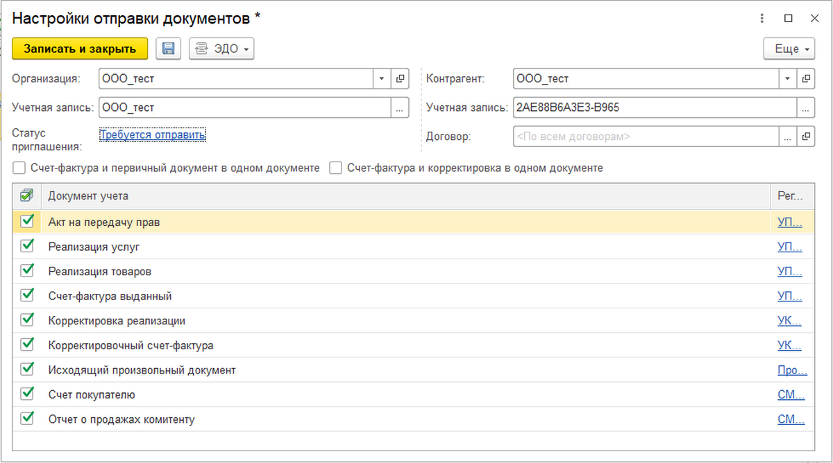 - Выбираем отправителя и контрагента-получателя. При этом учетная запись будет установлена автоматически. Если учетная запись в базе отсутствует, возможна отправка по e-mail. При этом если некоторое документы учета не будет задействованы в работе, с них галочки должны быть сняты.