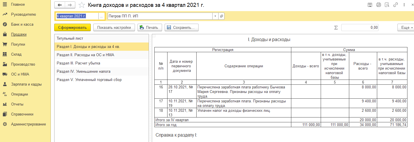 - «Сводно по всем работникам» — для отражения оплаты труда в КУДИР нужно создать документ «Запись книги доходов и расходов УСН».