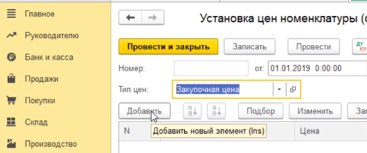 Далее нужно установить цену для нашей номенклатуры. Нажимаем кнопку добавить.