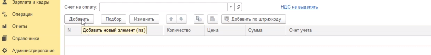 Выбрали склад и далее заполняем табличную часть нашего документа.