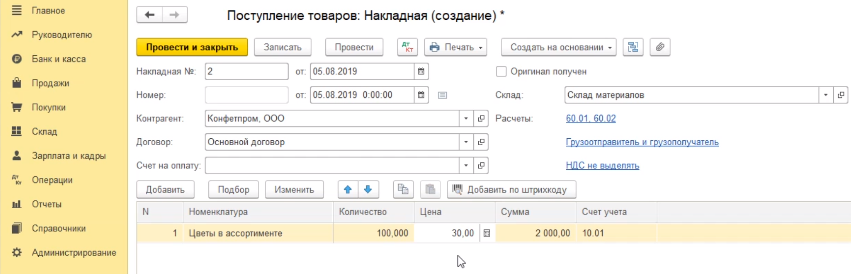 Указываем номер акта и дату поступления. Контрагента нашего поставщика. Выберем, например, "Конфетпром". Автоматически подтягивается основной договор с "Конфетпром".