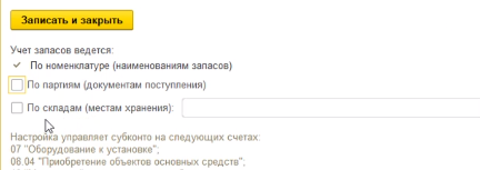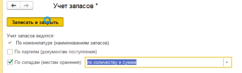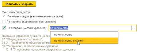 Мы ставим эту галочку и выбираем форму учета. То ли это будет учет по количеству номенклатуры, то ли это будет учет и по количеству номенклатуры и по сумме. Выбираем полный вариант - по количеству и сумме.