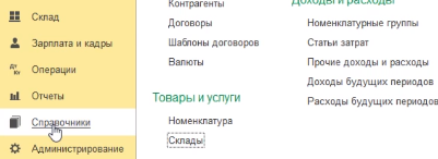 После этого мы можем переходить в справочник наших складов. Раздел справочники, склады.