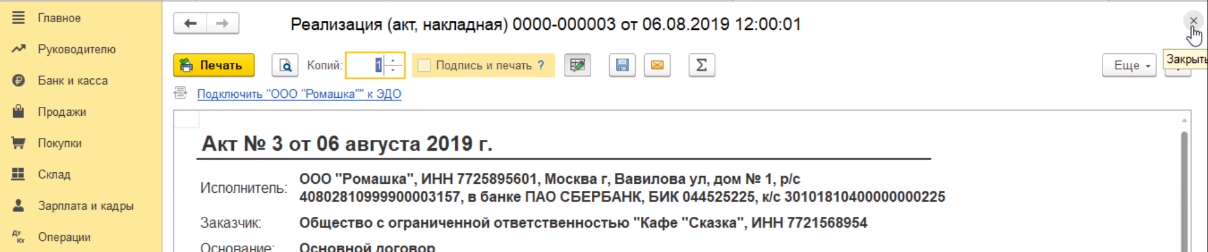 Затем переходим в печатную форму. Выбираем акт об оказании услуг.