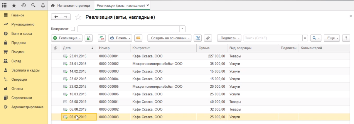 Для этого идем в раздел продажи, реализация (акты, накладные).