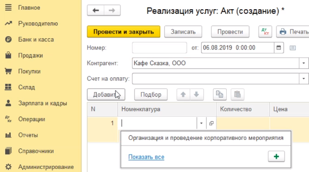 Выбираем ООО кафе "Сказка" и переходим к заполнению табличной части, в которой мы непосредственно должны указать ту услугу, которую мы покупателю оказали.