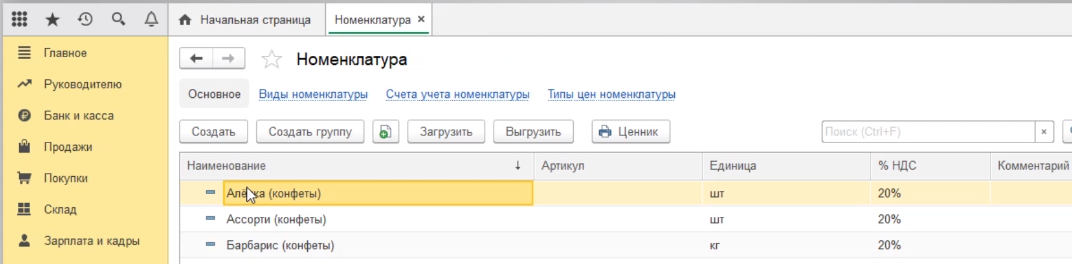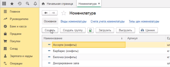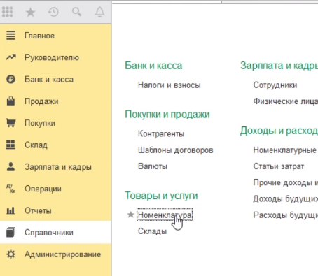Для этого переходим в раздел справочники, номенклатура.