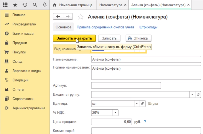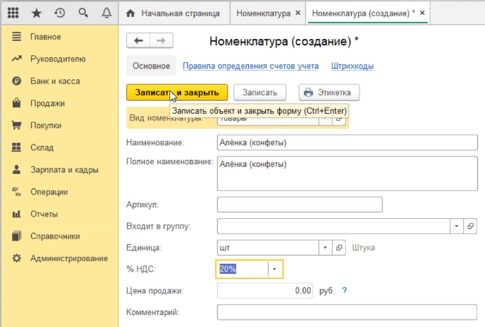 Мы с вами создали очередную номенклатурную позицию. Для того, чтобы записать ее в справочник нажимаем кнопку записать и закрыть.