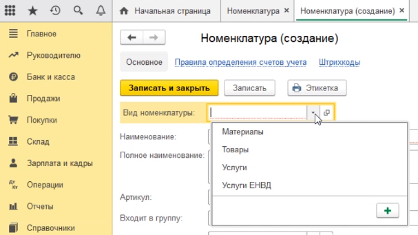 Что мы с вами обязательно должны заполнить. Первое мы должны указать вид номенклатуры. В программе уже созданы четыре вида номенклатуры - материалы, товары, услуги и услуги ЕНВД.