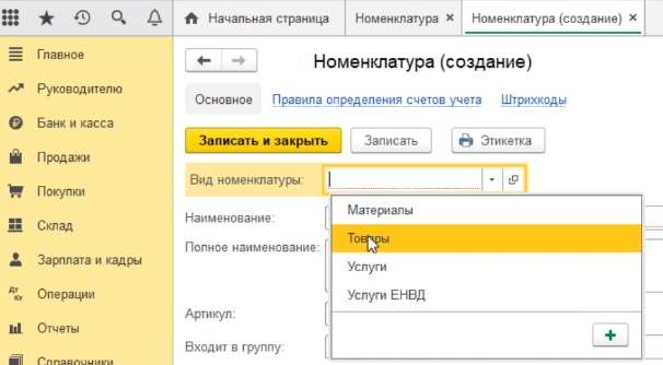 В нашем случае мы будем создавать товар. Выбираем вид номенклатуры – товар.