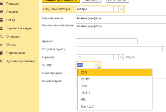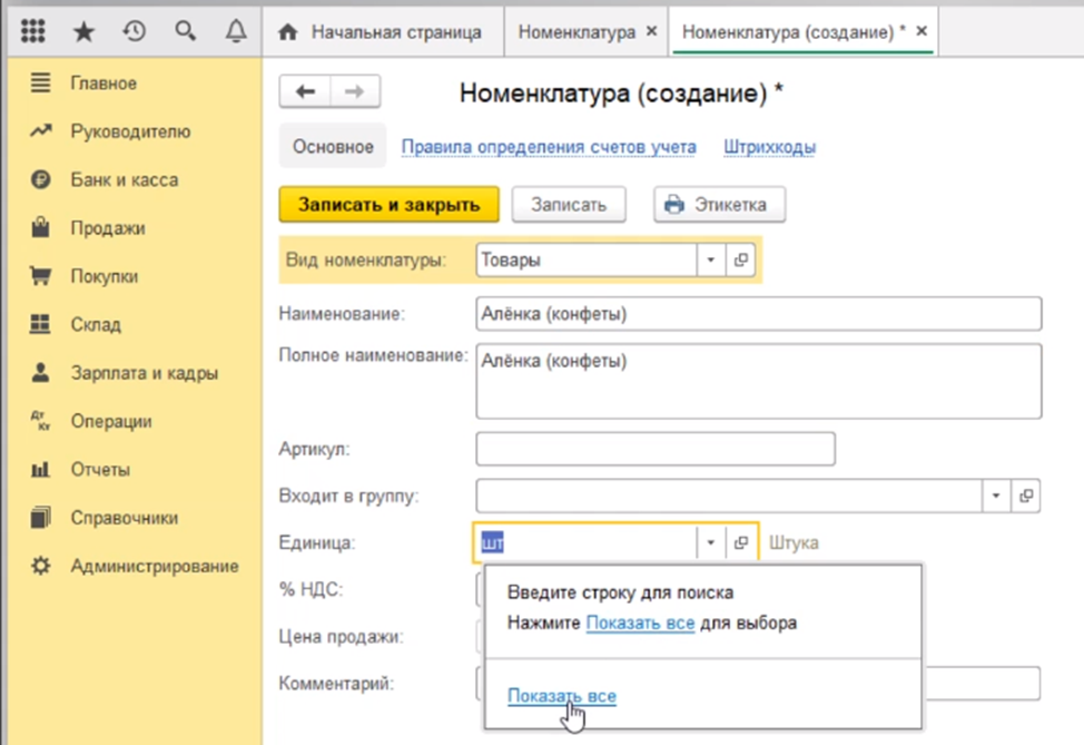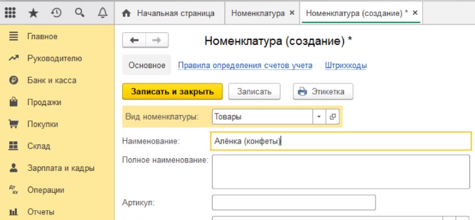 От вида зависит какие счета учета номенклатуры по умолчанию программа будет подставлять в документы. Далее заполняем наименование нашего товара. Например, конфеты Аленка.